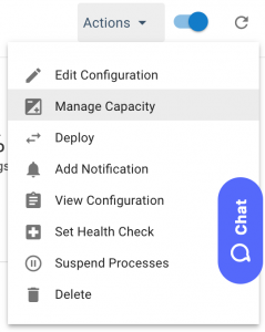 To update the Elastigroup capacity, select the desired Elastigroup in the Elastigroups view. Under the Actions menu, select Manage Capacity.