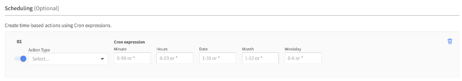 Click + Add Task, select an action type, and enter the times you want to define with Cron expressions.