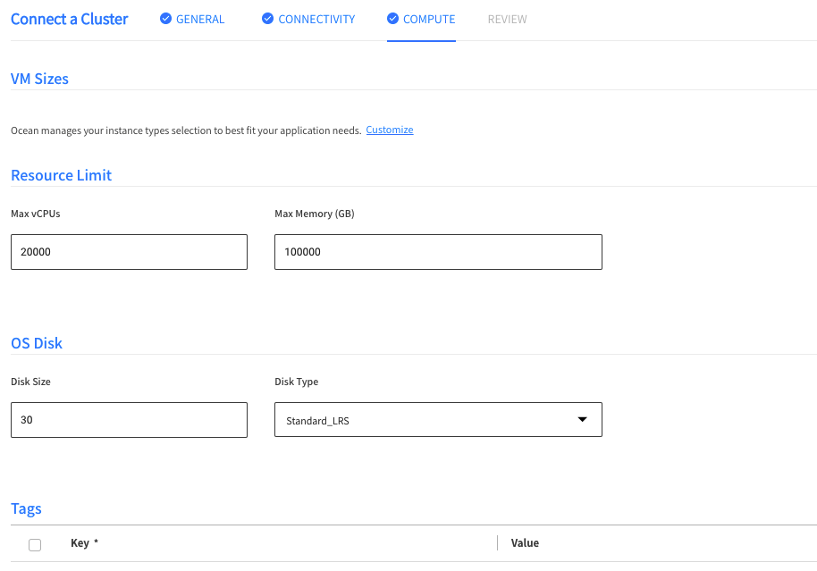 On the Compute page, you will see that the fields are populated with the values imported from the AKS private cluster configuration. You may choose to keep these values or modify them.